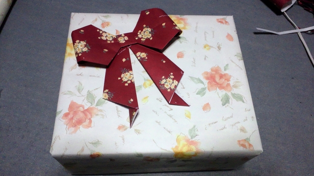 で、甥っ子にプレゼントしたら、折り紙のりぼんに気づいたようで、