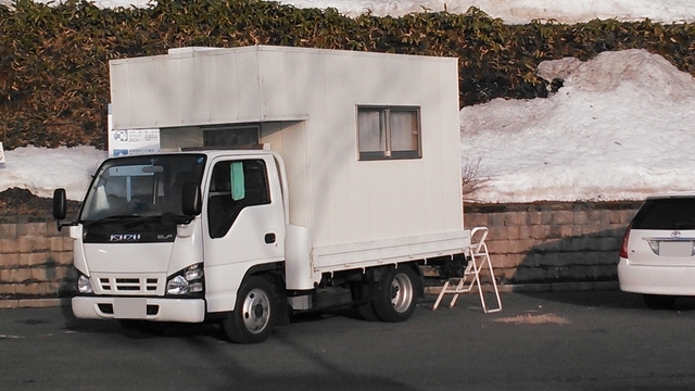 トラックにプレハブ小屋を乗っけて、キャンピングカーにしてるようだ。