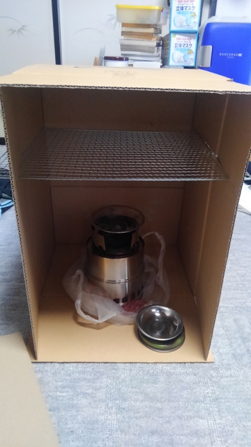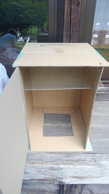 amazon箱を開いて、上部に100均網を挿して。